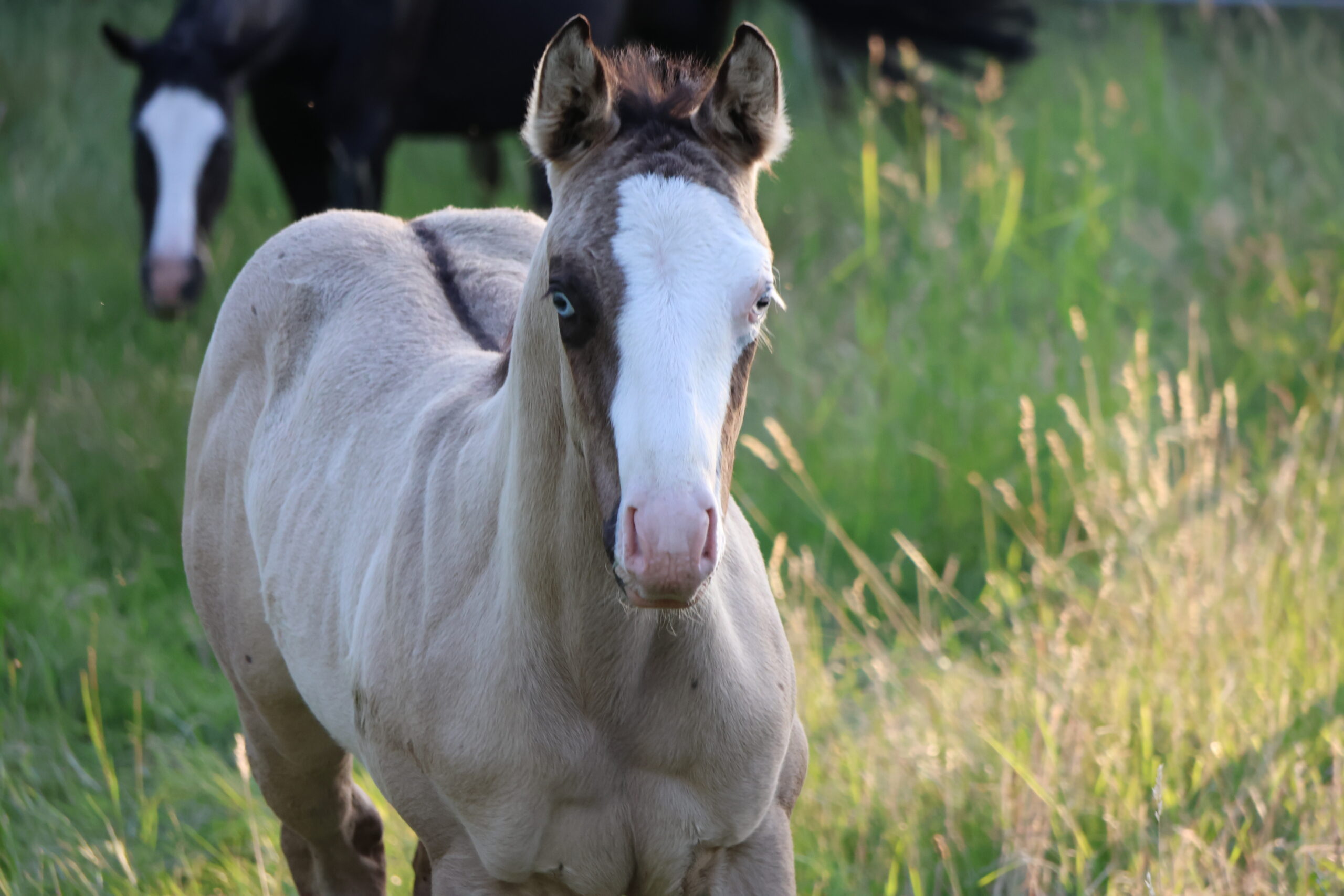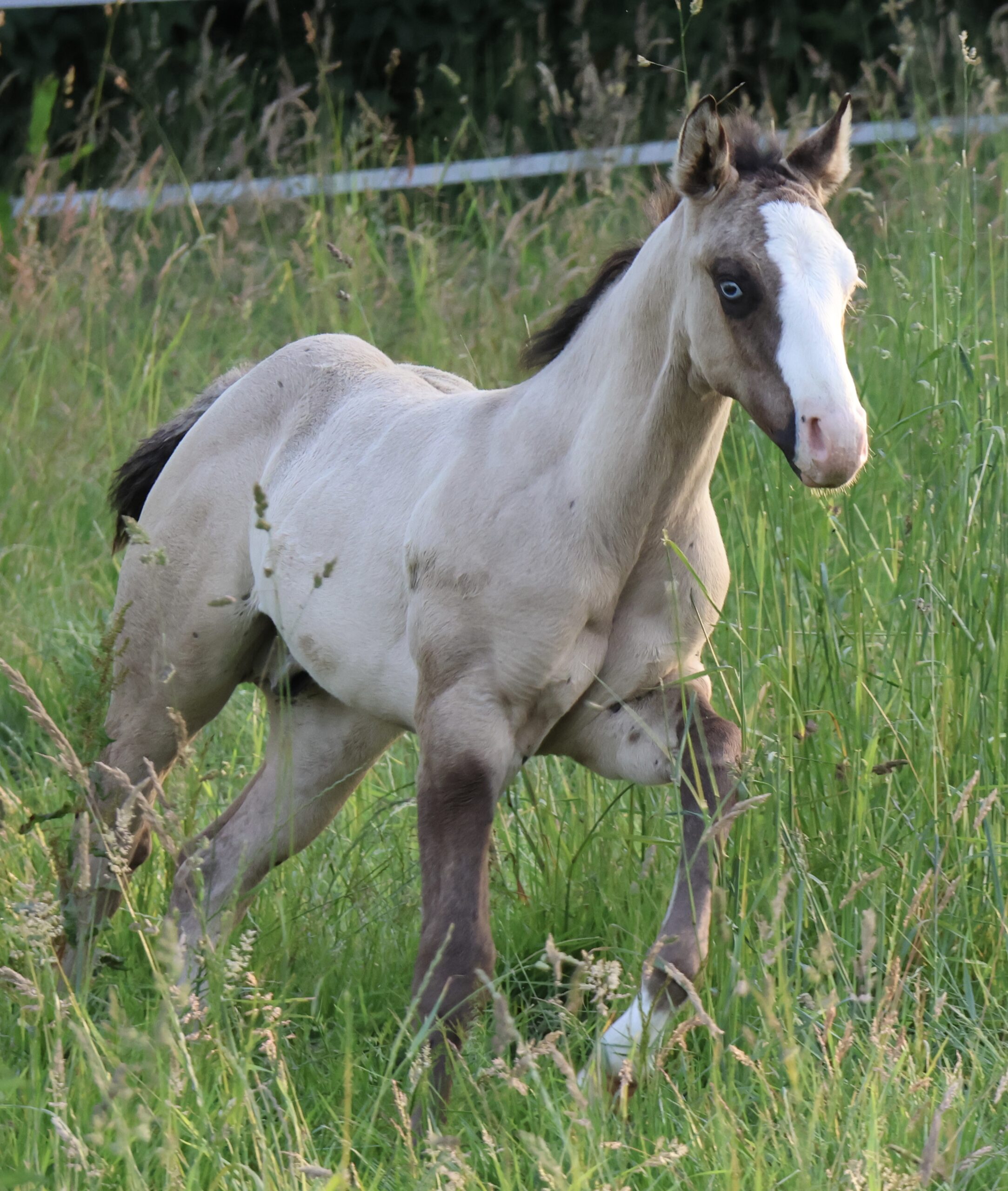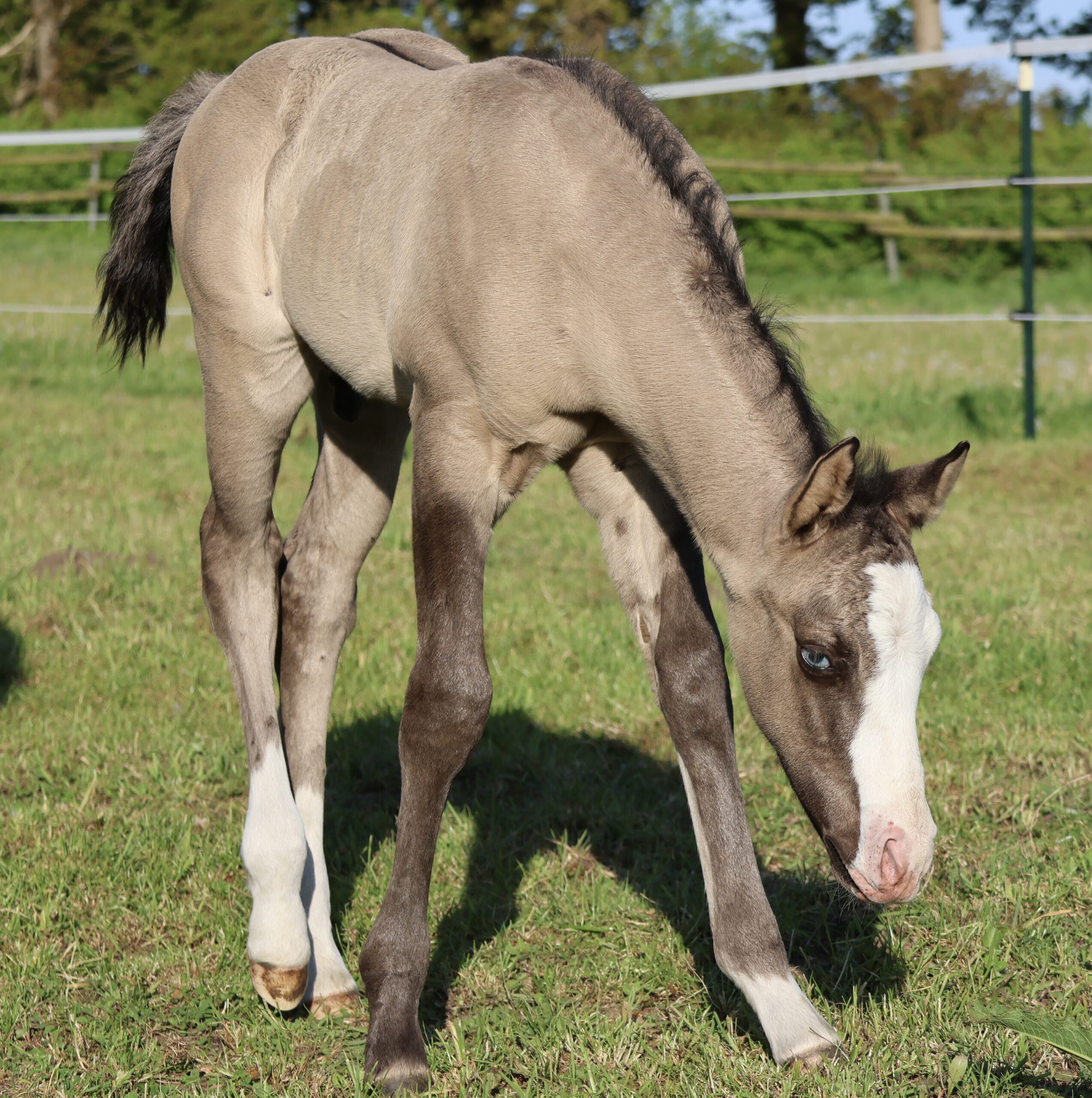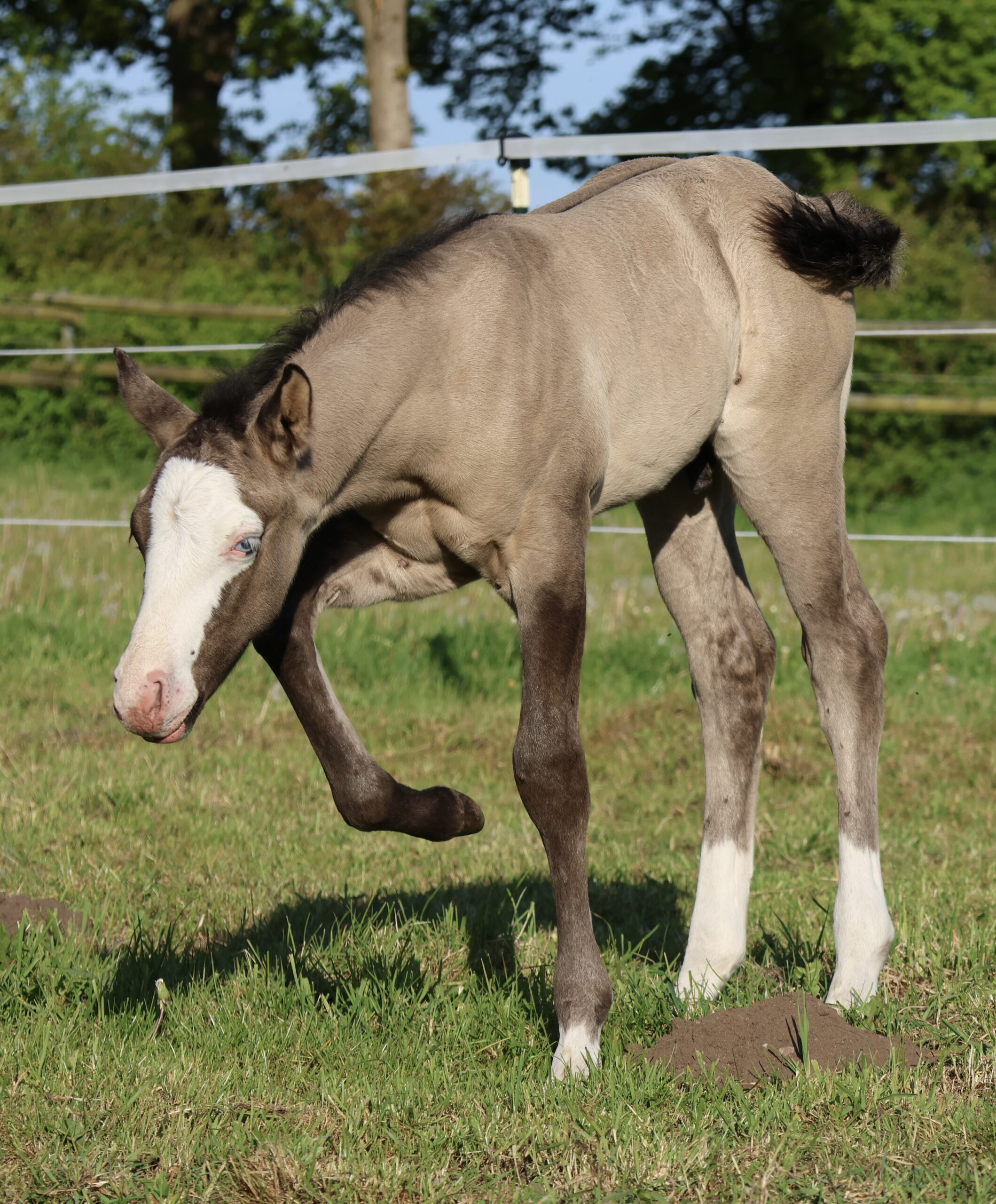 Bluey – Ein besonderes Hengstfohlen in der seltenen Farbe Smoky Grullo Splash White mit zwei blauen Augen.