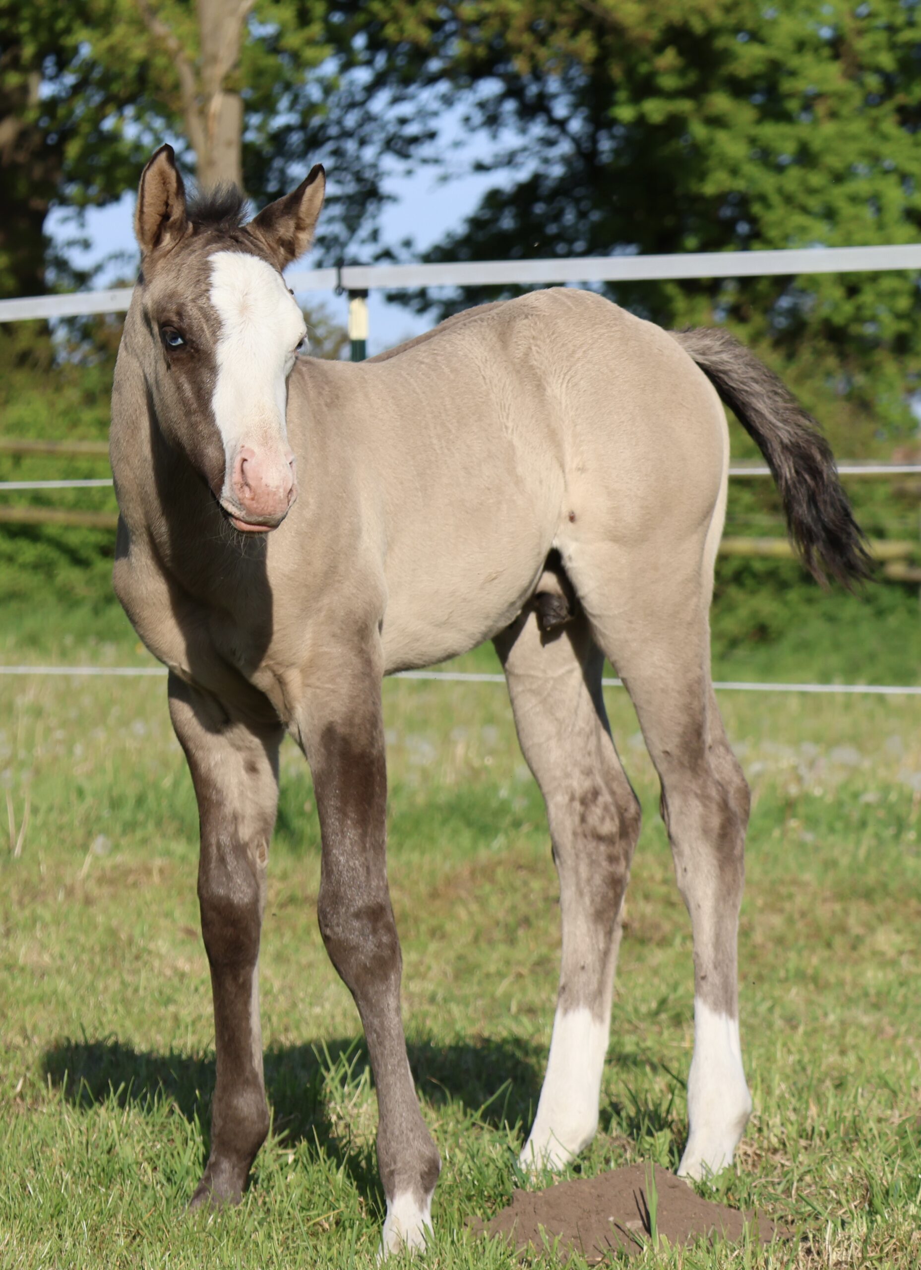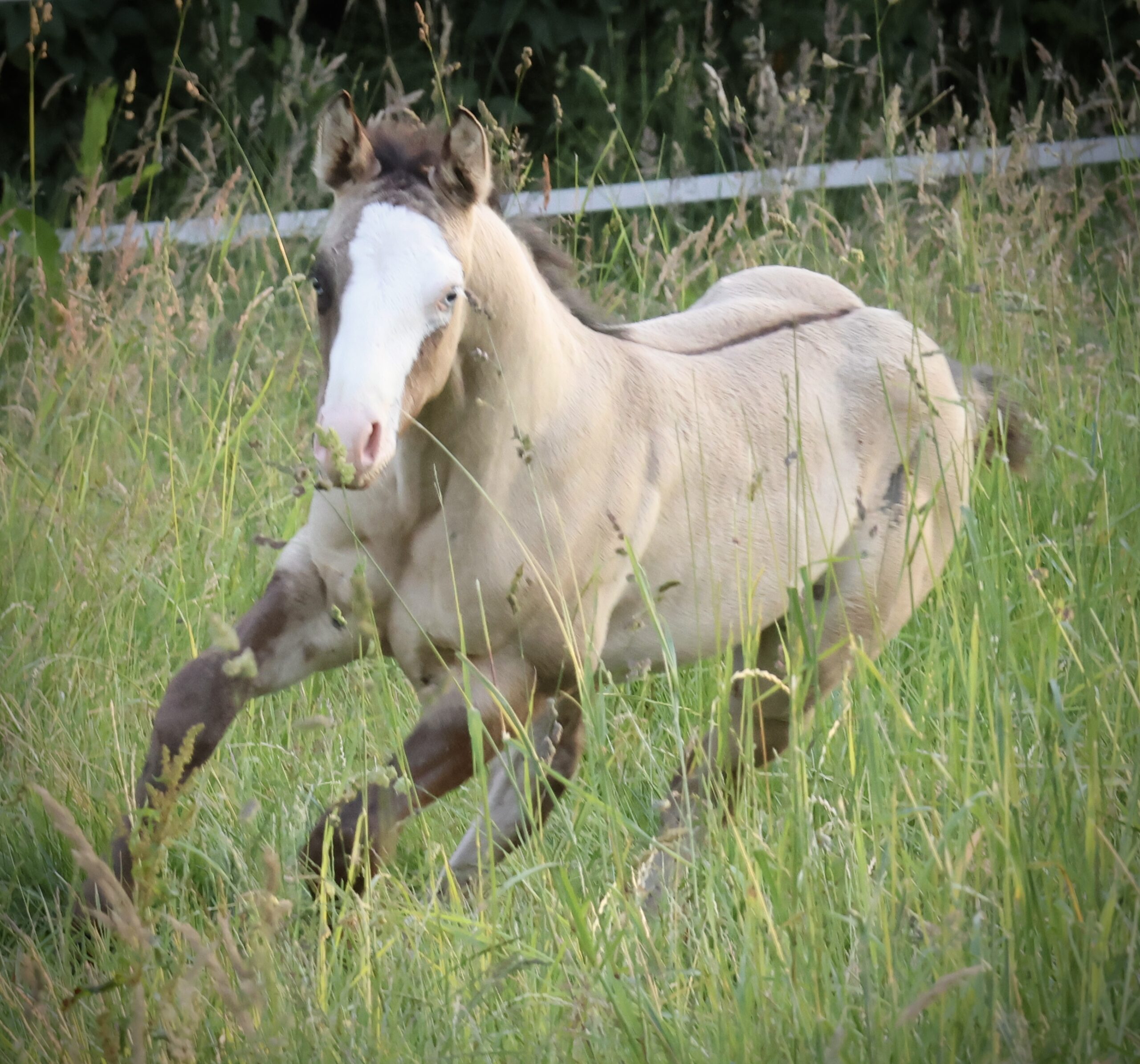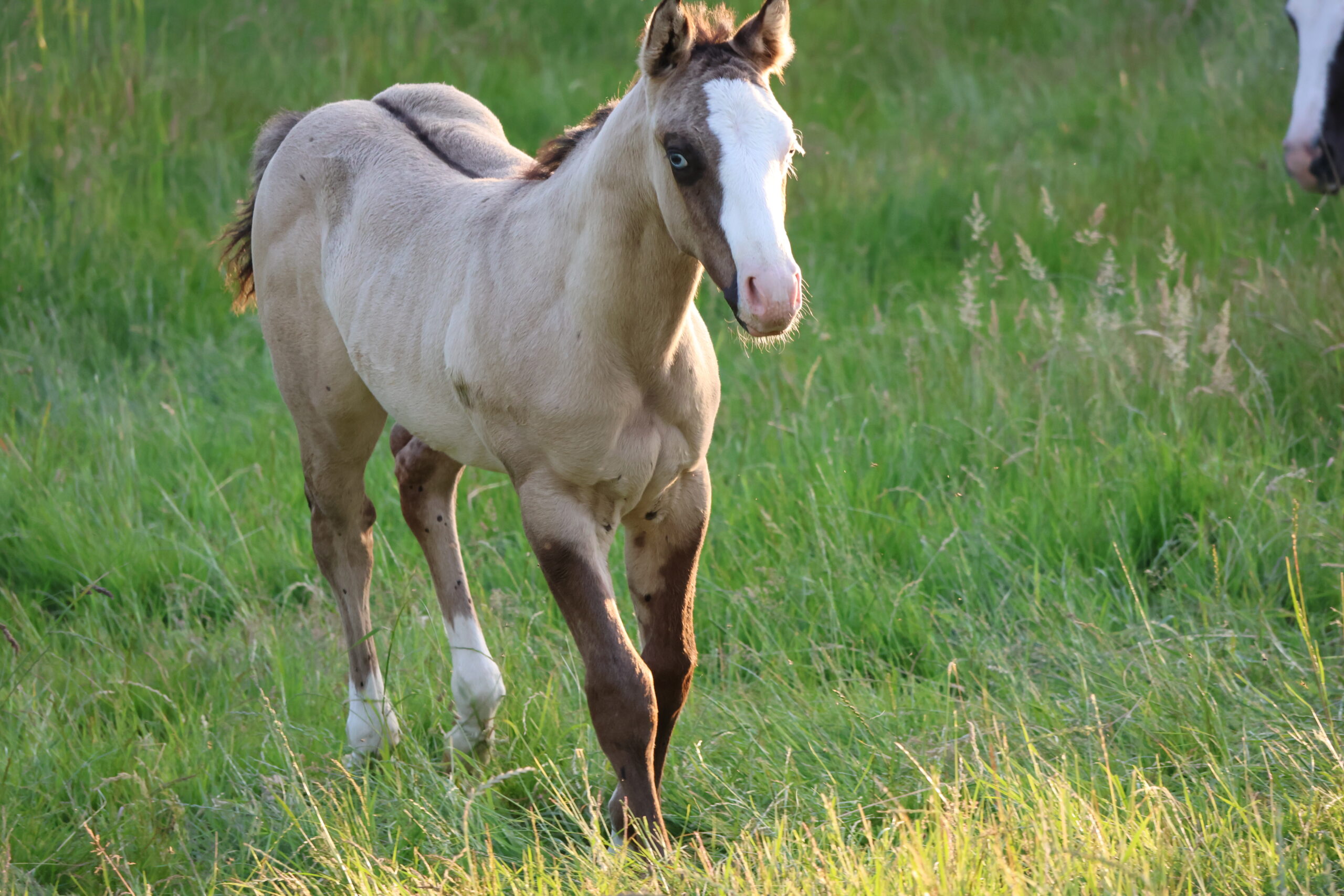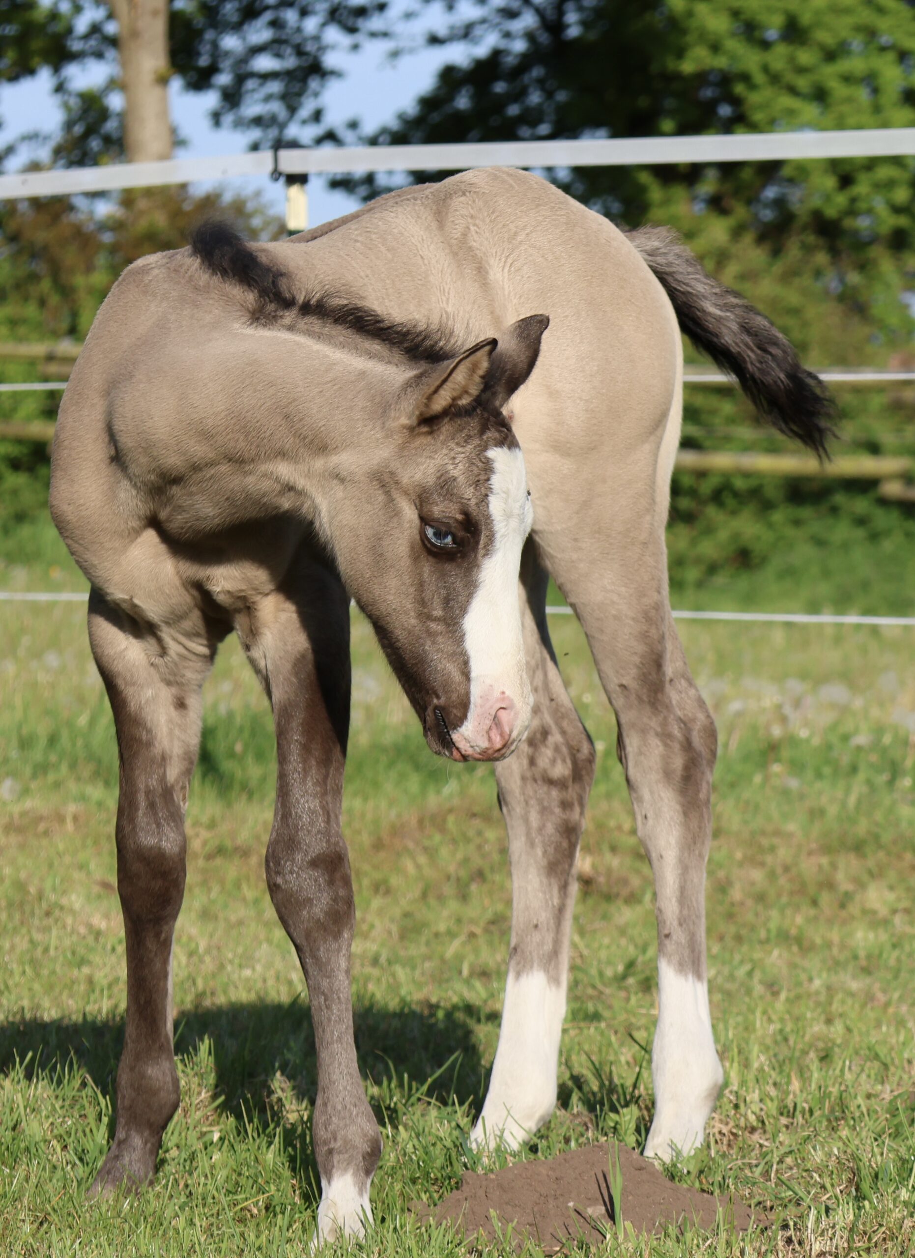 Bluey – Ein besonderes Hengstfohlen in der seltenen Farbe Smoky Grullo Splash White mit zwei blauen Augen.