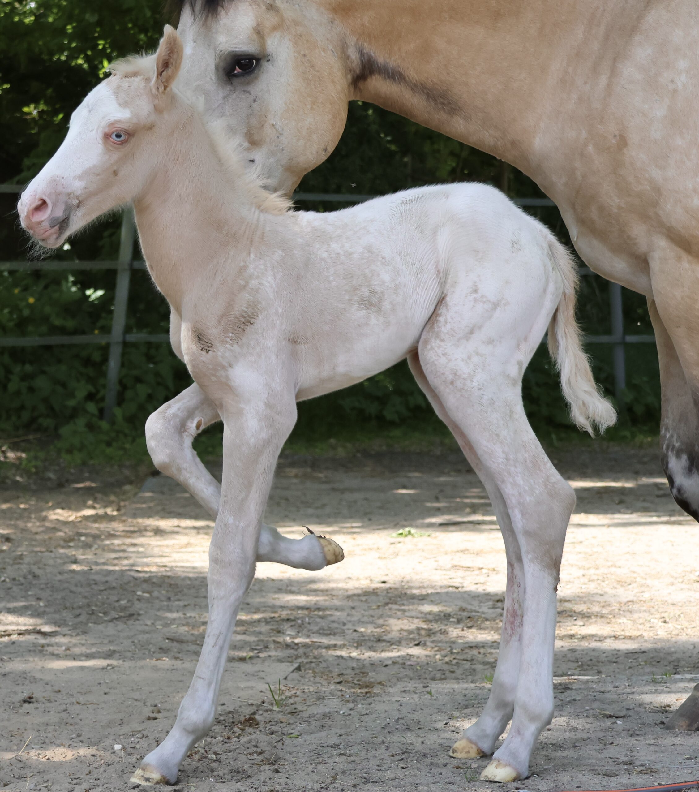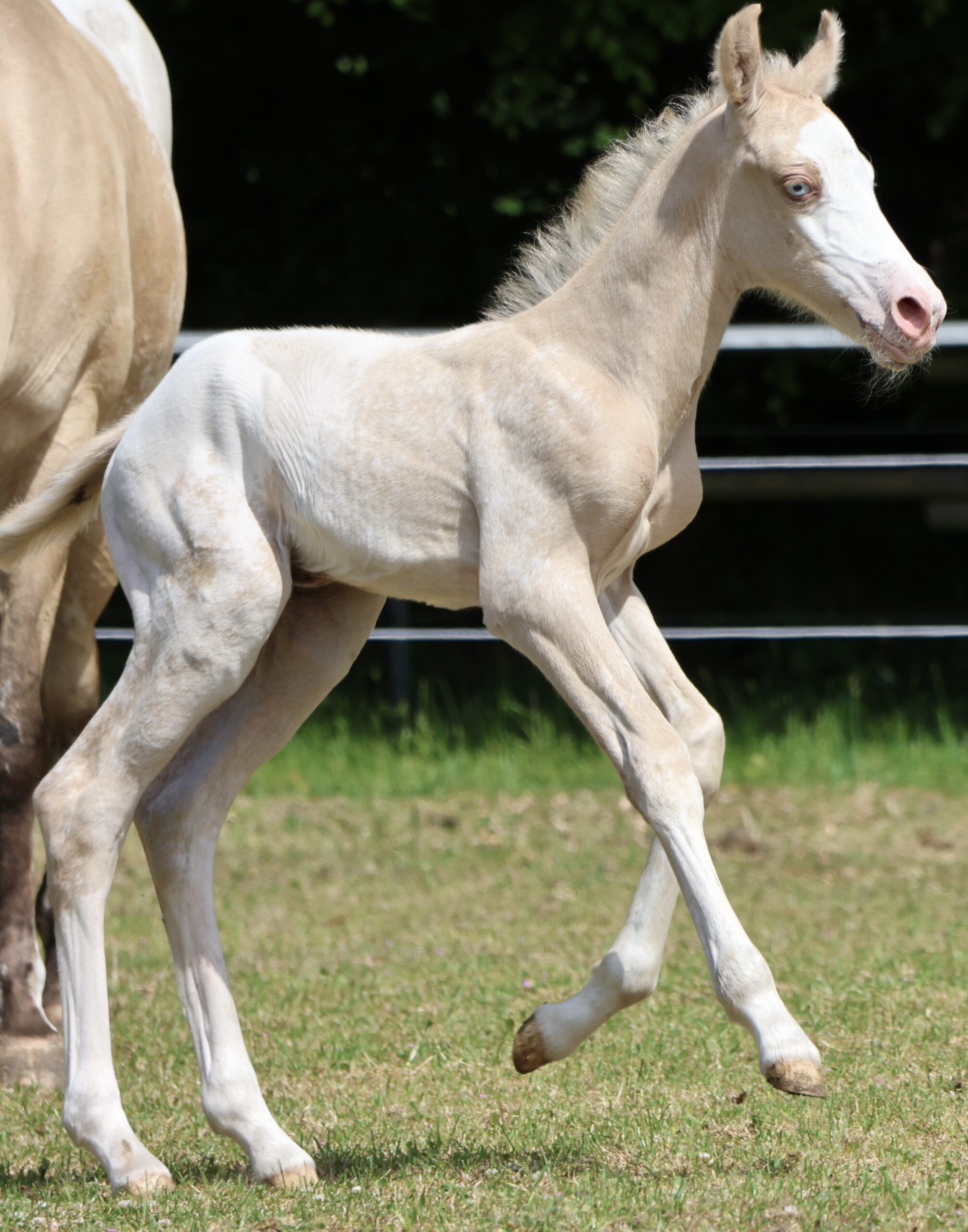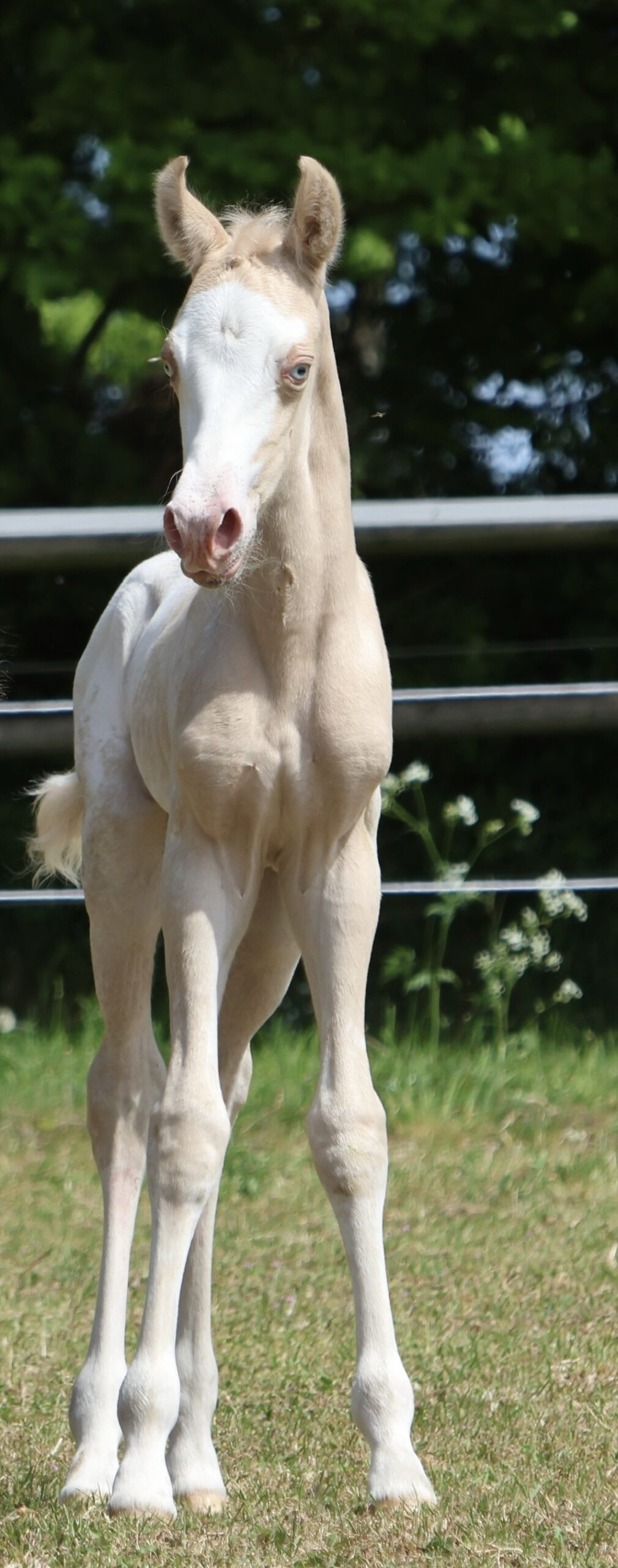 Auch farblich ist sie ein echter Hingucker: Palomino mit auffälligem Blanket, vier weißen Beinen und einer markanten Blesse. Ihre zwei blauen Augen verleihen ihr zusätzlich einen ganz besonderen Ausdruck.